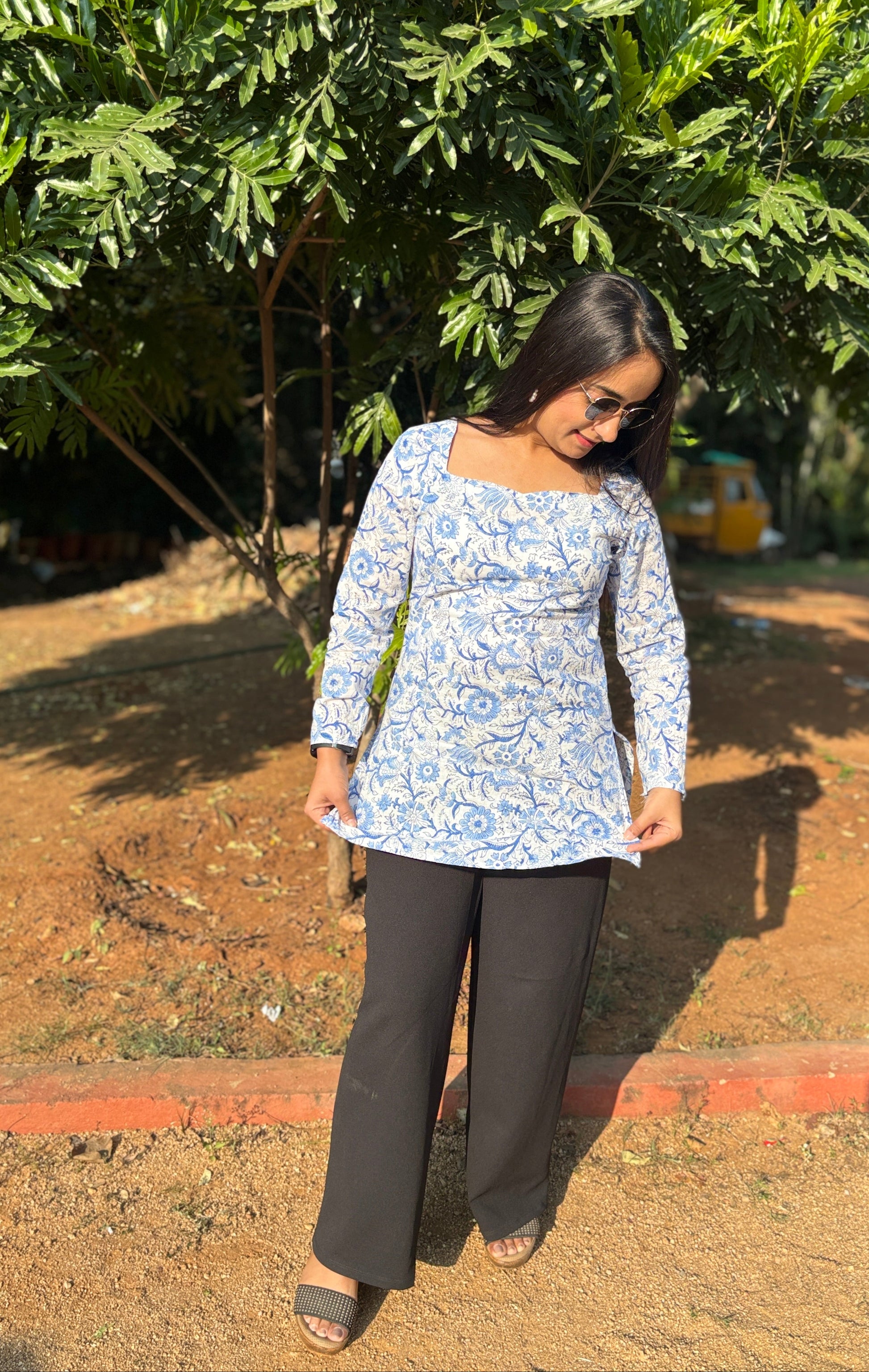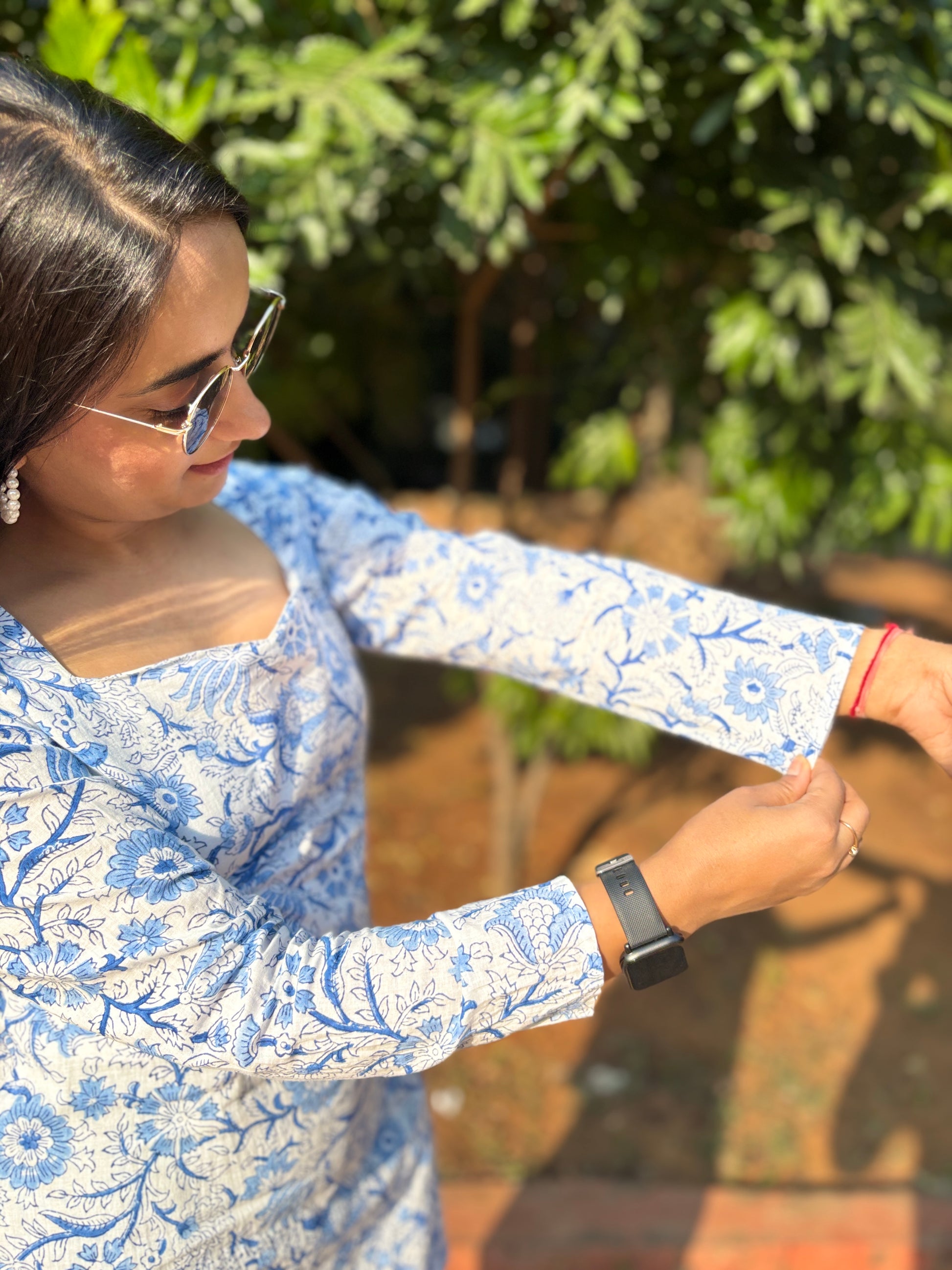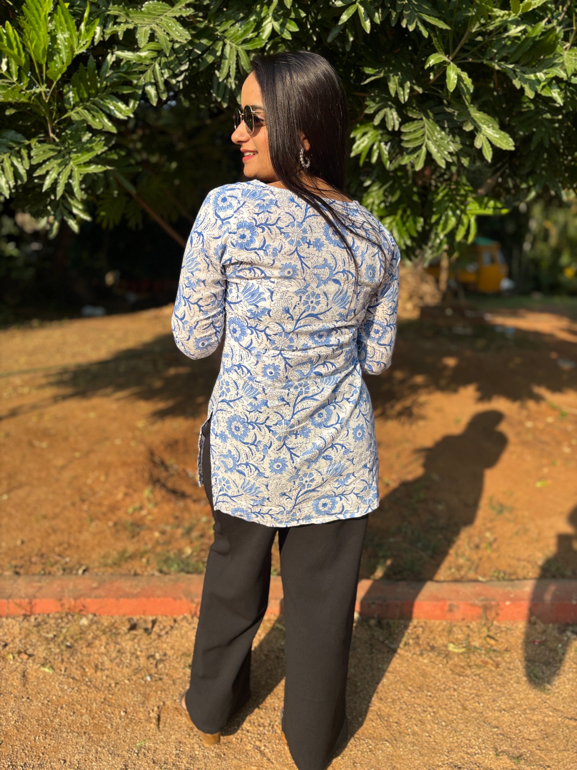 Step into effortless elegance with Ambar Neel, a beautifully crafted short cotton kurti inspired by the soothing hues of the sky. Made from soft, breathable cotton, this full-sleeved kurti features an exquisite light to medium blue floral Jaipuri print set against a pure white base—creating a look that is refreshing, graceful, and timeless.