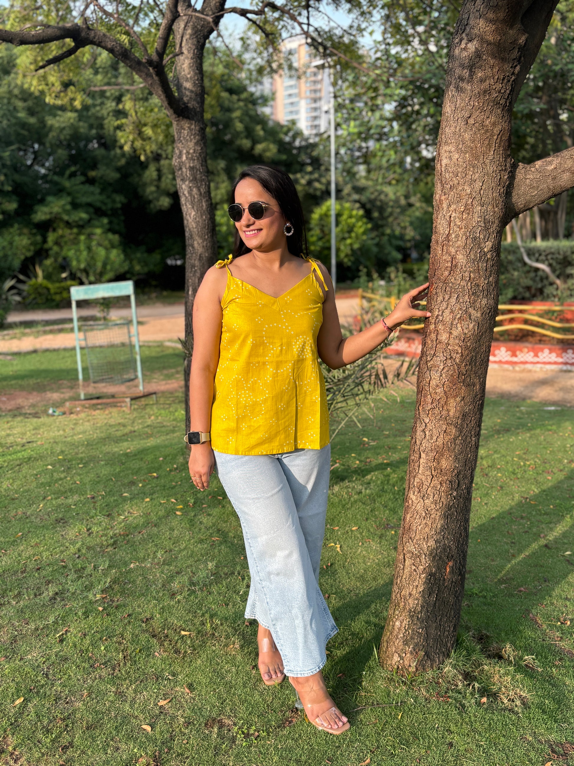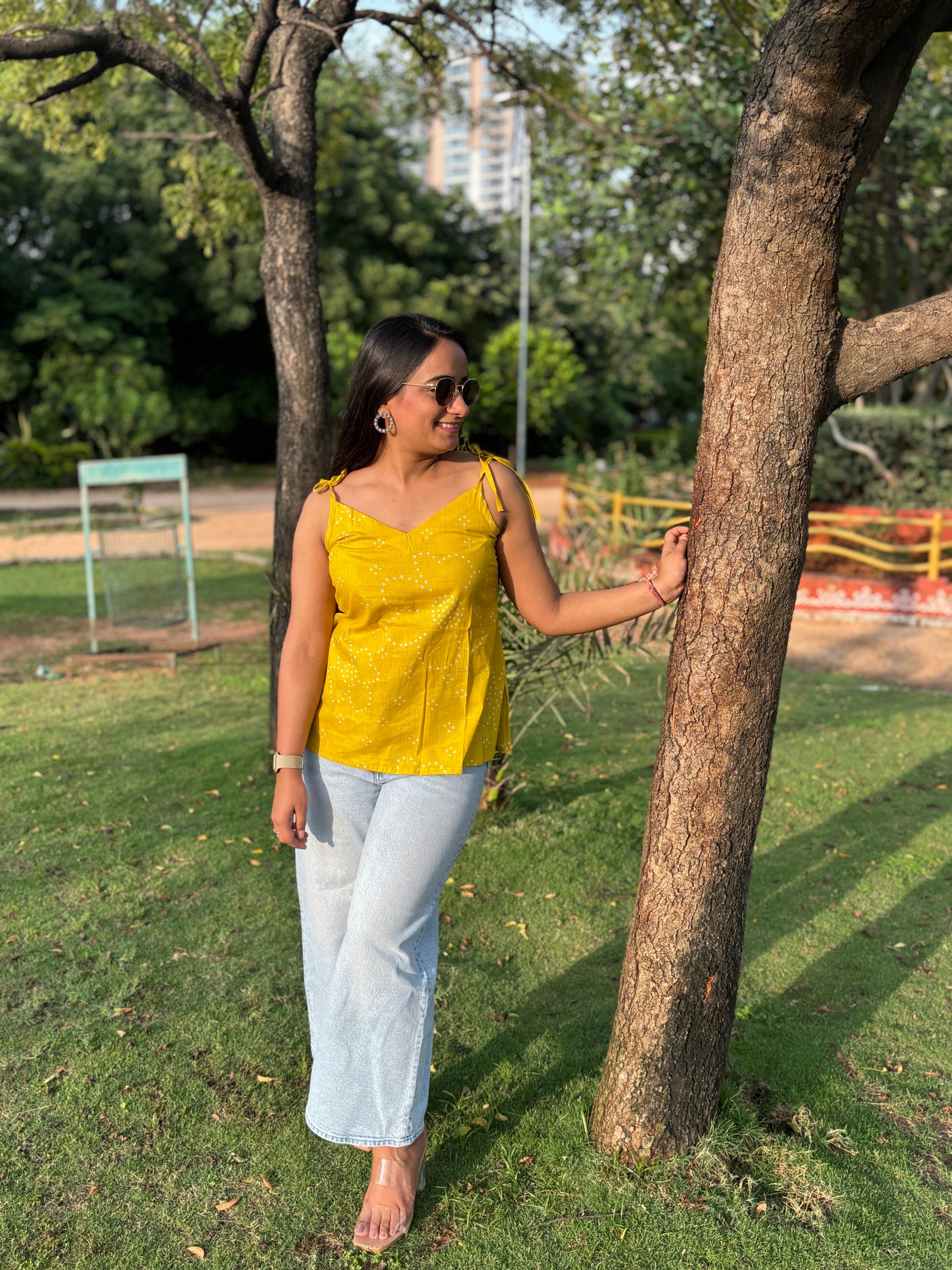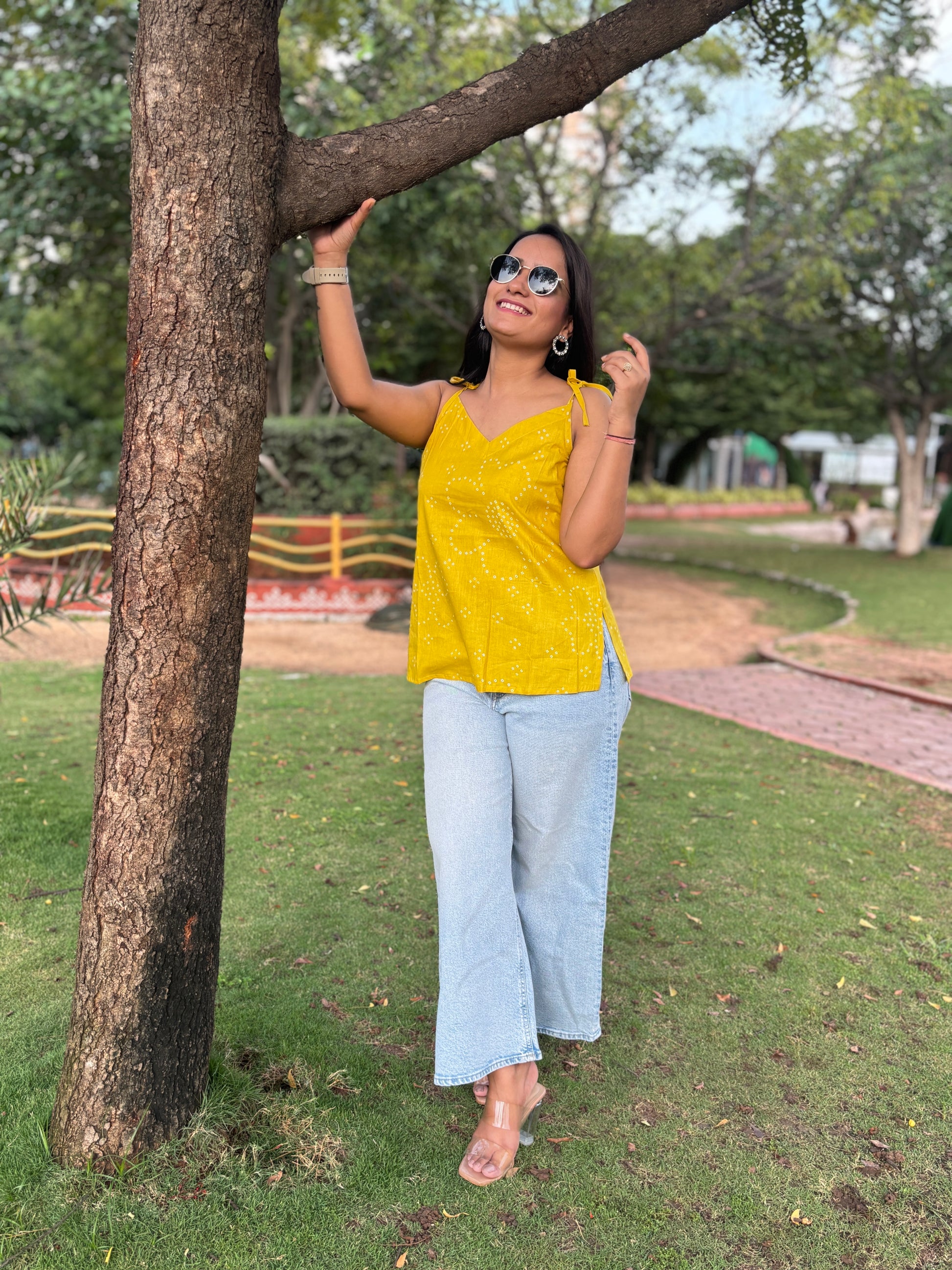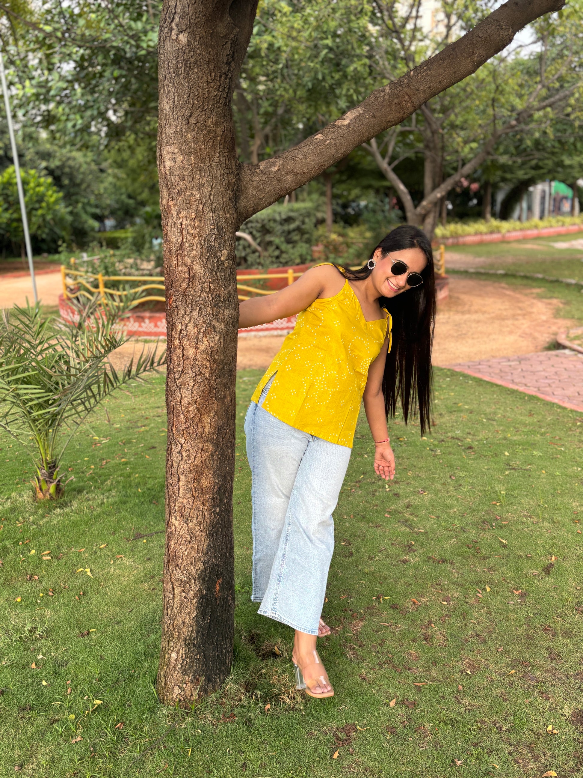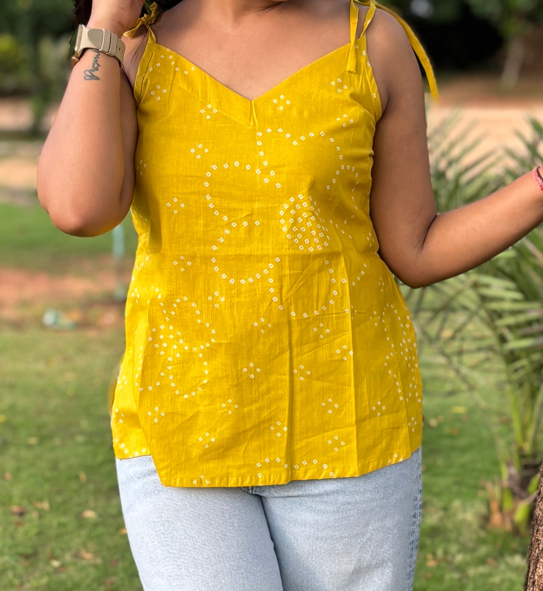 Drenched in the warmth of tradition, the Rajwadi Rang kurti captures the essence of festive charm in a modern silhouette. The lively mustard yellow canvas, patterned with dainty bandhani-inspired motifs, brings an instant pop of brightness to your look. Tie-up straps and a softly curved neckline add playful detailing, while the breathable cotton fabric makes it a joy to wear through any season. Style it with denim for an easy everyday vibe or pair it with whites for a graceful, ethnic-inspired touch — Rajwadi Rang is designed to stand out, effortlessly.