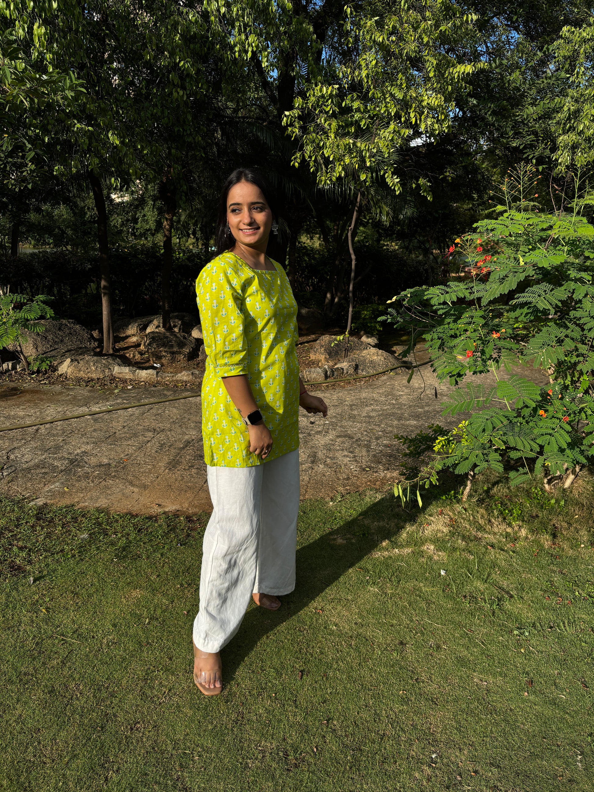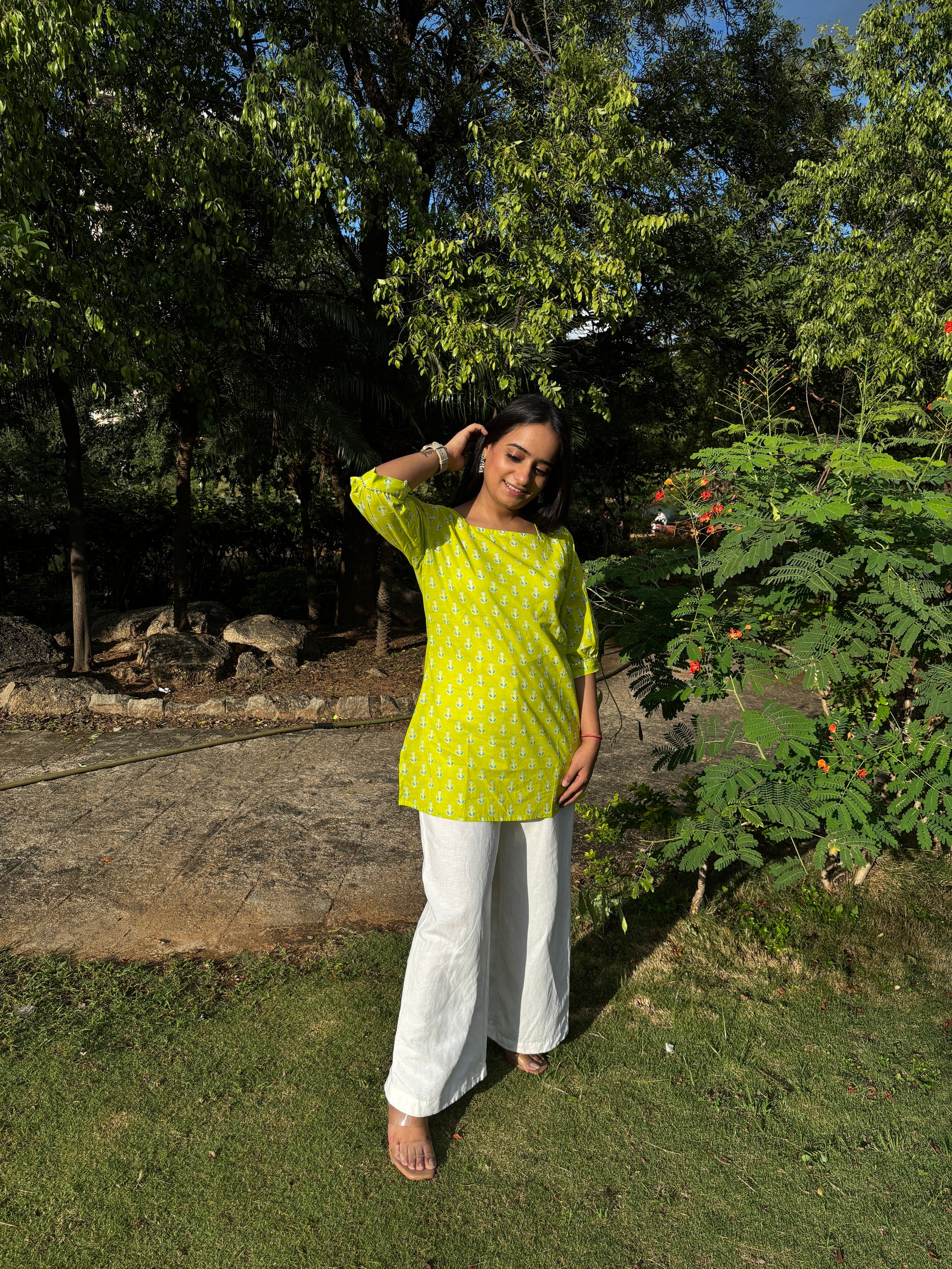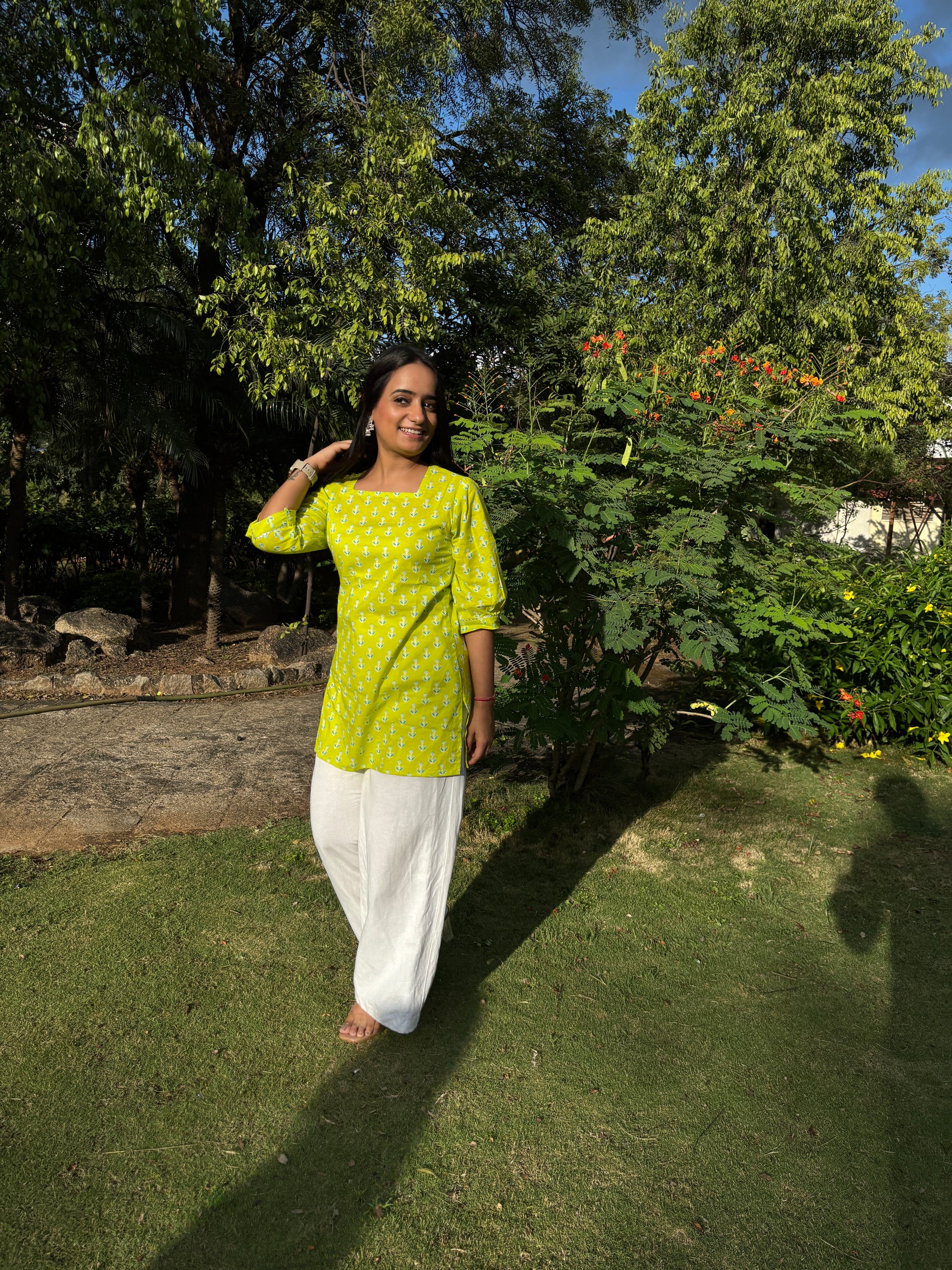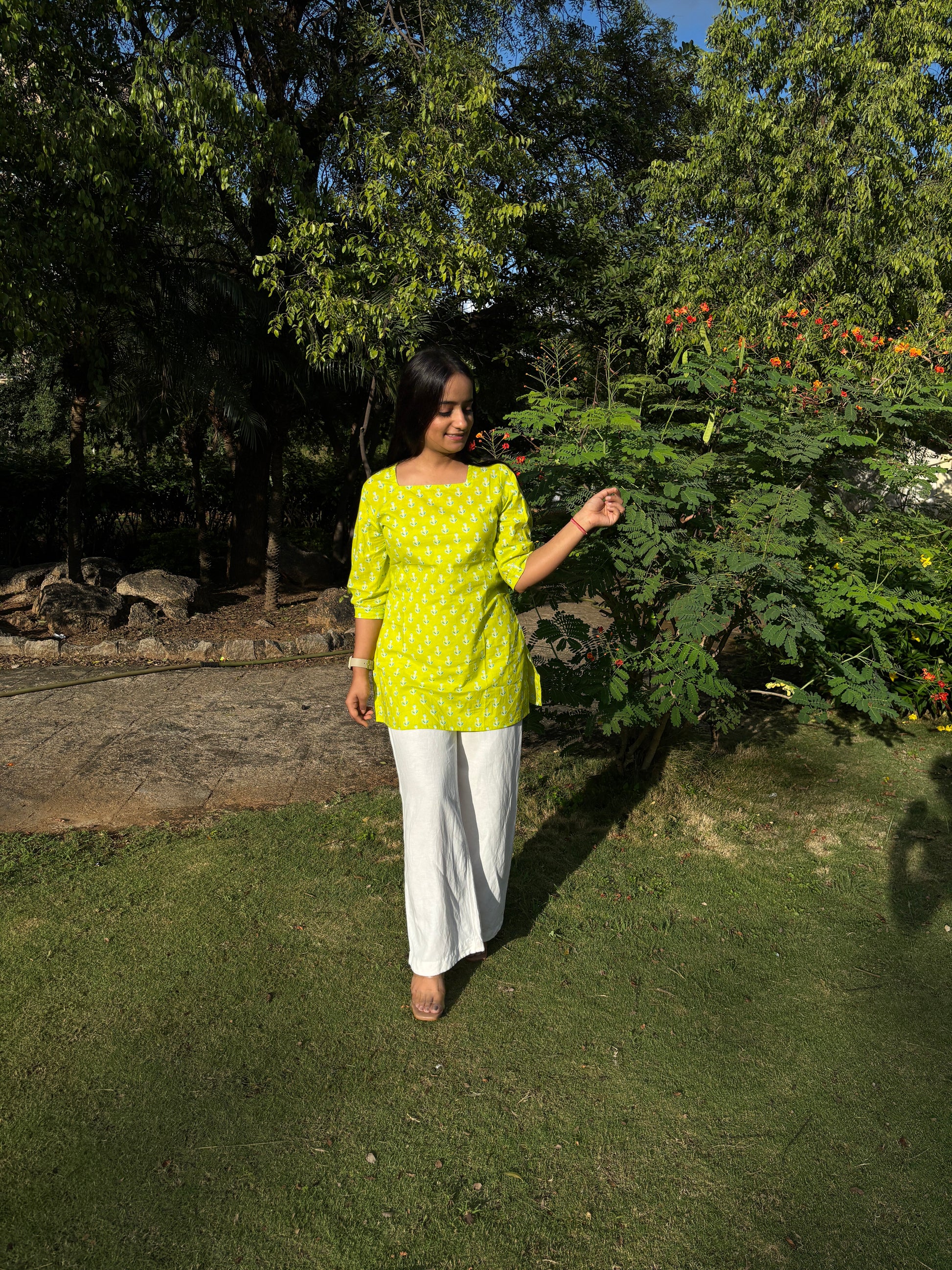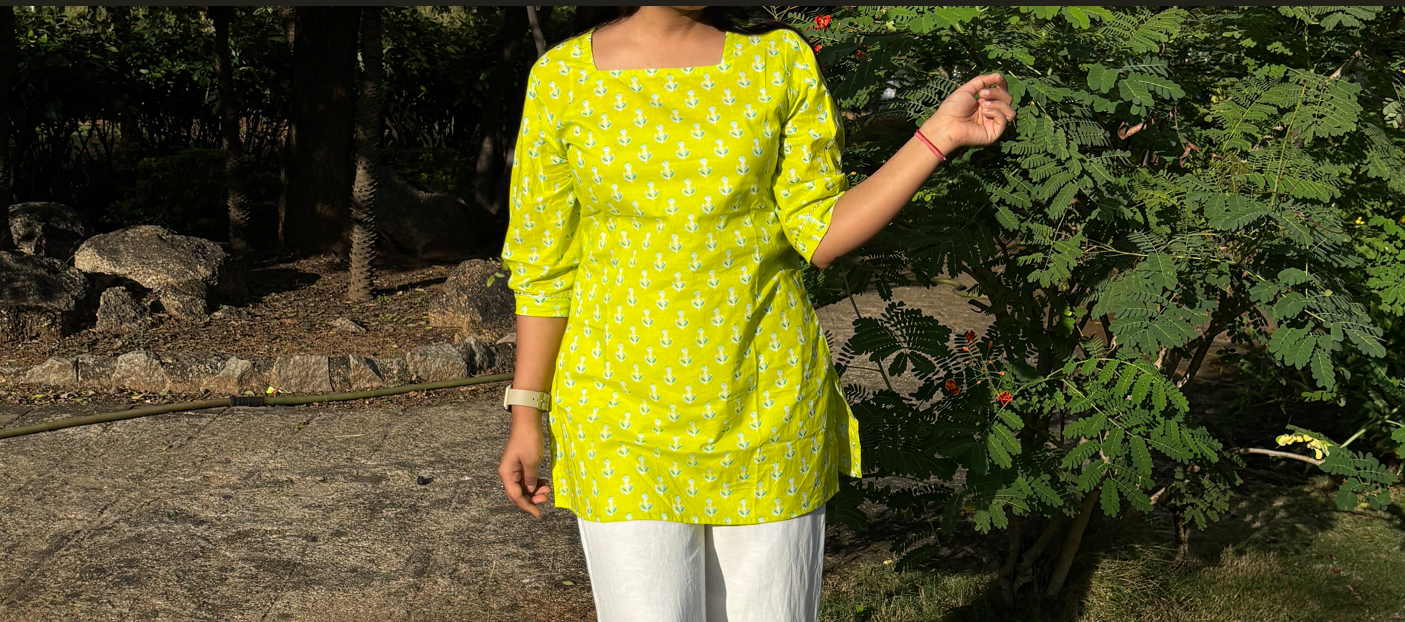 Inspired by the quiet melody of the forest, Vanraagini brings a refreshing burst of green to your everyday style. Crafted in soft cotton, this lime-green short kurti features a delicate hand-block–style print of tiny white and blue butis—each motif adding a rhythmic, almost musical charm to the fabric. The square neckline and easy three-quarter sleeves give it a clean, graceful silhouette, perfect for warm days and unhurried moods.